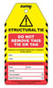 A Structural Tie Test Tag which records the specific scaffolding tie test date, test load applied, required tensile strength and a unique reference number for ongoing monitoring. Helps you to comply with legislative requirements and good practices of: