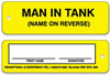 Used in conjunction with Entrytag®. The approved person(s) each have a dedicated Man in Tank Tag (containing their details) and attach it to the Entrytag® (using the metal ring supplied) before entering and remove it when leaving the confined space. By counting the number of Man in Tank Tags at the point of entry, it is instantly clear how many people are working in the tank. |