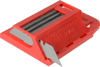 | A pack of 100 standard utility knife blades in a handy storage holder which can be hung on a hook or nail when not in use. |