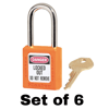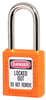 The Master Lock No. 410KAORJ Zenex™ Thermoplastic Safety Padlock, Keyed Alike – multiple locks open with the same key – features a 1-1/2in (38mm) wide plastic orange body and a 1-1/2in (38mm) tall, 1/4in (6mm) diameter metal shackle. Designed exclusively for Lockout/Tagout applications, the durable, lightweight, non-conductive lock body is easy to carry and padlock features high security, reserved-for-safety cylinder with key retaining, to ensure padlock is not left unlocked.