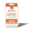 | Gel-clear Micro-tabs are designed for residential splits and tank pumps preventing biofilm blockages and improving efficiency. Effective for 3 months, Micro-tabs stop water leaks, reduce risks, reduce maintenance costs and reduce operating costs. Approved by the world’s largest condensate pump manufacturers, Gel-clear leaves a coating on all the drains and the pump, protecting the pump from biofouling, the biggest cause of pump failure. One tablet placed below the coil in the condensate pan of each unit guarantees protection from blocked condensate drains for up to 3 months. |