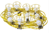| The Faithfull Festoon Light Set, comes on a 22 metre arctic cable supplied with 10 x ES GLS rough service bulbs (110V), each bulb is protected by a lightweight yellow plastic cage. These festoon lights will provide a very effective solution to illuminating a large area on site by hanging the lights in one room and to another across a landing, etc. Instant light without the possibility of shadows that can be caused by using tripod lighting. Fitted with a 16 amp 110 volt plug. |
