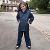 Children's kids waterproof coat jacket and trousers rain suit set. Available in 3 colours and 5 children's sizes from 3-12 years. The Jacket: