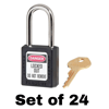 | Black Zenex™ Thermoplastic Safety Padlock, 1-1/2in (38mm) Wide with 1-1/2in (38mm) Tall Shackle, Keyed Alike The Master Lock No. 410KABLK Zenex™ Thermoplastic Safety Padlock, Keyed Alike – multiple locks open with the same key – features a 1-1/2in (38mm) wide plastic blue body and a 1-1/2in (38mm) tall, 1/4in (6mm) diameter metal shackle. Designed exclusively for Lockout/Tagout applications, the durable, lightweight, non-conductive lock body is easy to carry and padlock features high security, reserved-for-safety cylinder with key retaining, to ensure padlock is not left unlocked.