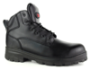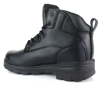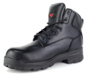 Smooth grain black leather uniform safety boot. The water resistant leather upper helps keep feet dry in wet conditions. Breathable inner lining helps keep feet comfortable during long work days. The ergonomic rear ankle collar helps maneuverability when driving. Specially designed 90° Heel Ladder Grip for industries that involve climbing and require the added safety.