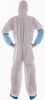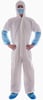 Coverall made of polypropylene laminated with a microporous polyethylene film, with zipper and hood, elasticated arm, and foot band (latex-free). Lightweight and breathable, air-permeable, and waterproof. Supplying a normal barrier against dry particles and a limited liquid splash of chemicals.