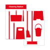 Shadow Board Cleaning Station (Board B, Red) made from an Aluminium Composite Panel with Anti-Scuff Laminate, for hard wearing, long lasting durability. Complete with 317mm Professional Medium Banister Brush, 325mm Open Dustpan, 305mm Professional Medium Sweeping Broom, Warning Wet Floor A-Board, Looped Hygiemix Mop and 12 litre Mop Bucket. Supplied with stainless steel hooks and some minor assembly is required. Size 610 x 2000mm.
