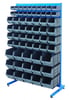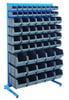 Free-standing parts and components storage. All-steel panel and base finished in a grease-resistant, powder-coated blue. Available as a single or double-sided unit and with a number of different bin combinations.
