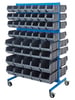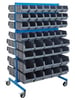 Mobile parts and components storage. All-steel panel and base finished in a grease-resistant, powder-coated blue. Available as a single or double-sided unit and with a number of different bin combinations.