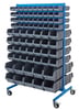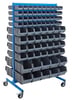 Mobile parts and components storage. All-steel panel and base finished in a grease-resistant, powder-coated blue. Available as a single or double-sided unit and with a number of different bin combinations.