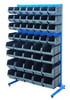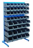 Free-standing parts and components storage. All-steel panel and base finished in a grease-resistant, powder-coated blue. Available as a single or double-sided unit and with a number of different bin combinations.