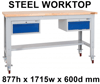 A range of suspended drawer and cupboard units are included to add storage to your workbench. A range of worktop options are available including Solid Hevea Wood, wipe clean Laminate and hardwearing Steel Worktops Fitted with x4 heavy duty swivel braked polyurethane castors A selection of widths and depths are available to suit user requirements Steel worktops include a retaining lip Height adjustable framework from 700mm to 1025mm at a 25mm pitch