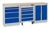 These 2041mm wide workbenches use a combination of two of our modular garage cabinets and a 5 drawer roll cabinet with a 38mm Multiplex or Stainless Steel worktop.