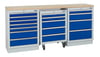 These 2041mm wide workbenches use a combination of two of our modular garage cabinets and a 5 drawer roll cabinet with a 38mm Multiplex or Stainless Steel worktop.
