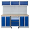 The cabinets are topped with a 38mm Multiplex Plywood or Stainless Steel worktop, perforated tool hook panels and a bank of wall cabinets.
