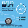 Ideal for fast pressure top ups - inflates a 15" tyre from flat to 35PSI in under 5 minutes. The large, backlit LED screen makes readings and inflation progress easily visible, and displays readings in PSI, KPA and BAR. The integrated LED light is ideal for inflating at night.