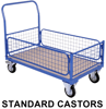 All trolleys are provided with 160mm certified castors. Trolleys with 4x swivel castors are designed for pushing and offer easier turning and maneuverability, similar to a shopping trolley. Trolleys with 2 fixed and 2 swivel castors are steadier in a straight line but do not manoeuvre as easily.