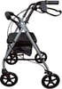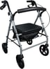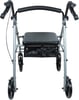Four Wheeled Foldable Rollator with a steel frame, padded seat and shopping bag.