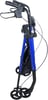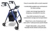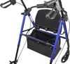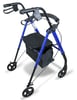 Lightweight four wheeled alumiunium and steel rollator with 6" puncture proof wheels. Foldable with a fabric padded seat and storage bag.