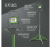 The SMD LED light is mounted to a 1.8m tripod via a quick-release mount. The mount can be easily removed for freestanding use or attached to flat surfaces via magnets located on the base. Crafted for rugged conditions, the aluminium body with rubber overmold provides excellent durability, while the IP44 rating protects against dust and splashes.