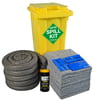 Evo Recycled 120 Litre Yellow wheelie-bin Spill Kit. For use on oil leaks and spills in the workplace for quick and efficient clean-up. Manufactured in Britain, EVO Recycled redefines safety within the spill control industry. It stands as the only absorbent matting in the UK tested to BS 4790 fire retardancy standards, ensuring unparalleled safety in environments prone to fire hazards. EVO Recycled also exceeds BS 1425 standards for material cleanliness and absorbs an average 25% more than comparable PP absorbents, cementing its position as the pinnacle of safety and quality in British Spill Control. Supplied with disposal bag for easy segregation of oily waste. Comes complete with one full tub of 100 Muckyz Textured Wipes.